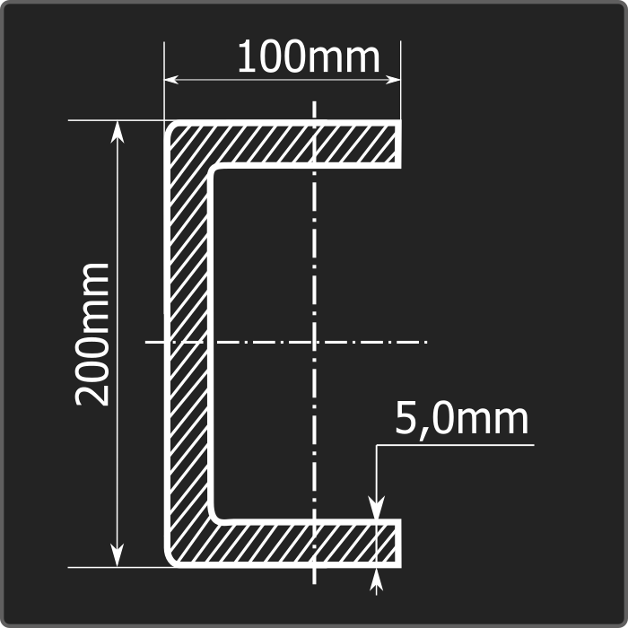 Швеллер стальной холоднокатаный гнутый равнополочный 200*100мм, толщиной 5,0мм и длиной 12м. Материал - углеродистая сталь. Соответствует требованиям ГОСТ 8278-83.