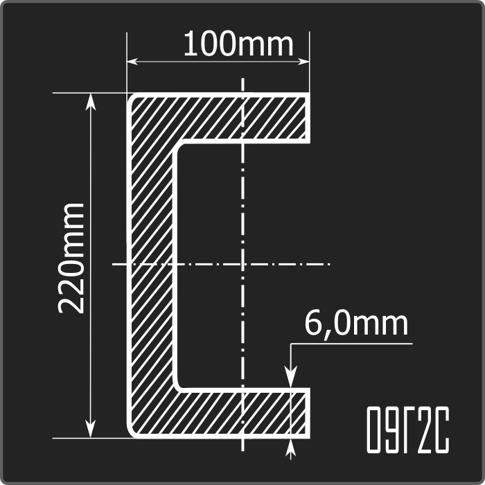 Швеллер стальной холоднокатаный гнутый равнополочный 220*100мм, толщиной 6,0мм и длиной 12м. Материал - низколегированная сталь. Соответствует требованиям ГОСТ 19281-2014.