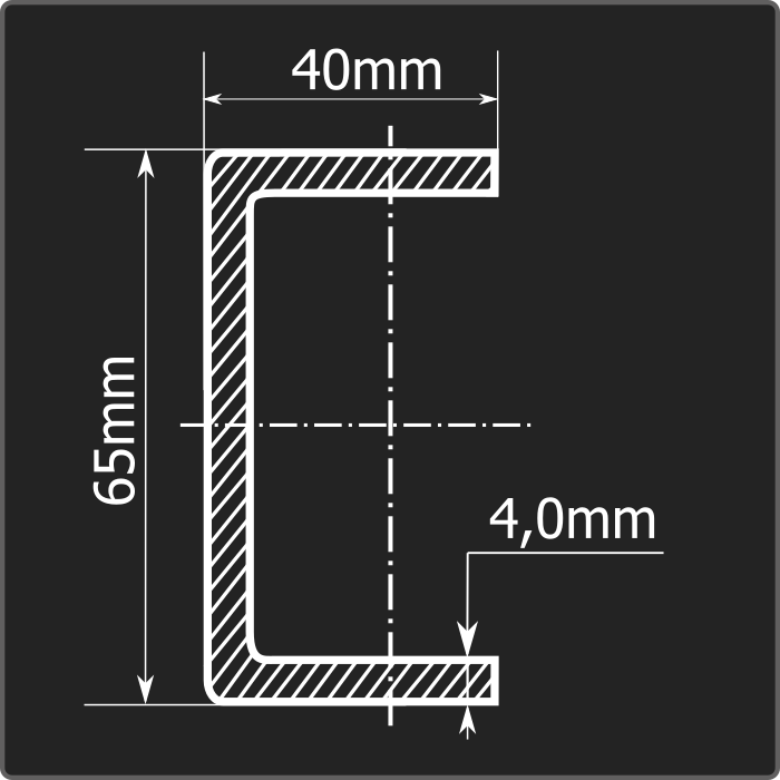 Швеллер стальной холоднокатаный гнутый равнополочный 65*40мм, толщиной 4,0мм и длиной 12м. Материал - углеродистая сталь. Соответствует требованиям ГОСТ 8278-83.