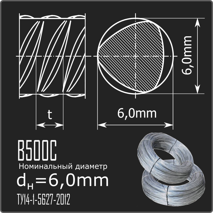 Арматурный прокат холоднодеформированный в мотках периодического профиля номинального диаметра dн 6,0мм класса В500 С (свариваемый). Соответствует требованиям ТУ14-1-5627-2012.