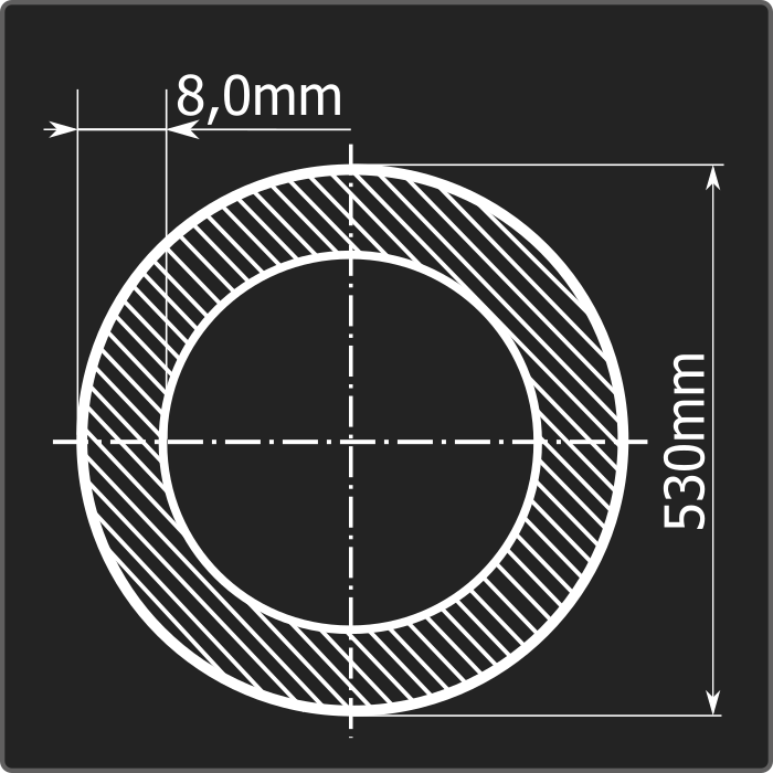 Труба электросварная стальная круглого сечения диаметром 530мм, толщиной 8,0мм и длиной 11,5-11,7м. Материал - углеродистая сталь. Соответствует требованиям ГОСТ 10705-80.