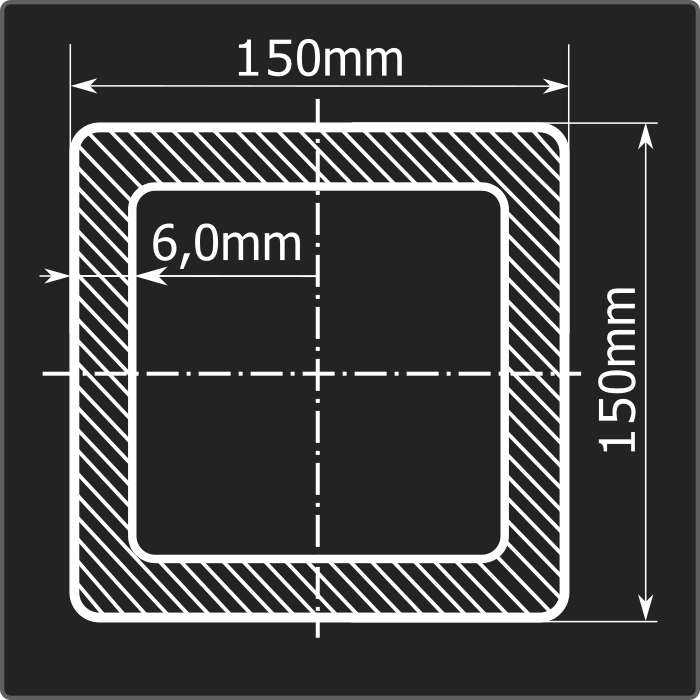 Труба профильная стальная квадратного сечения 150*150мм, длиной 12м и толщиной 6,0мм. Материал - углеродистая сталь. Соответствует требованиям ГОСТ 30245-2003.