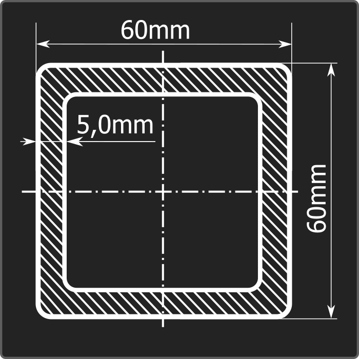 Труба профильная стальная квадратного сечения 60*60мм, длиной 12м и толщиной 5,0мм. Материал - углеродистая сталь. Соответствует требованиям ГОСТ 13663-86.